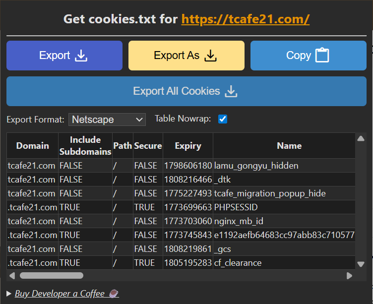 위 그림 처럼 나옵니다. 그러면 Export All Coolies를 눌러서 다운로드합니다.