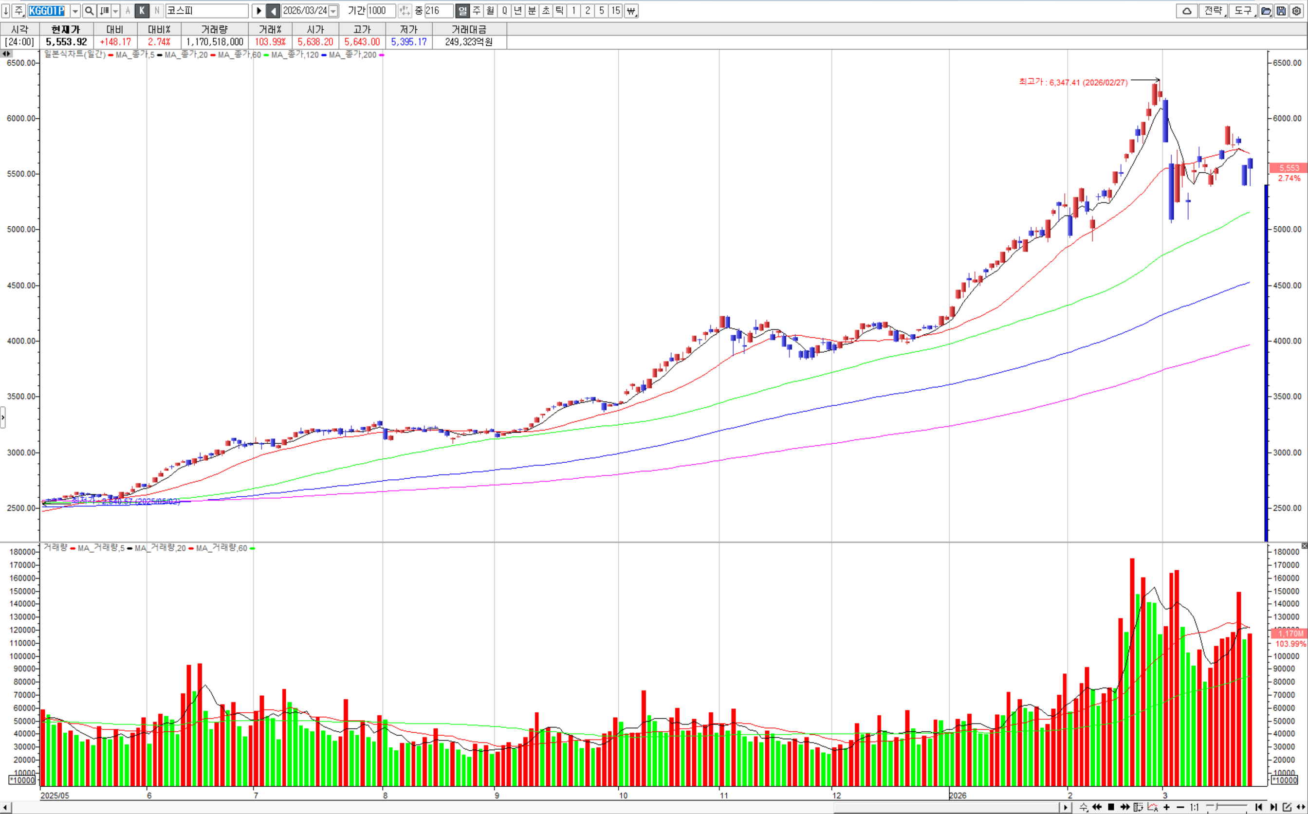 - 개장: 미-이란 간의 협상 가능성 보도와 뉴욕 증시 반등에 힘입어 코스피는 4.30% 급등한 5,638.20으로 시원하게 출발했습니다.